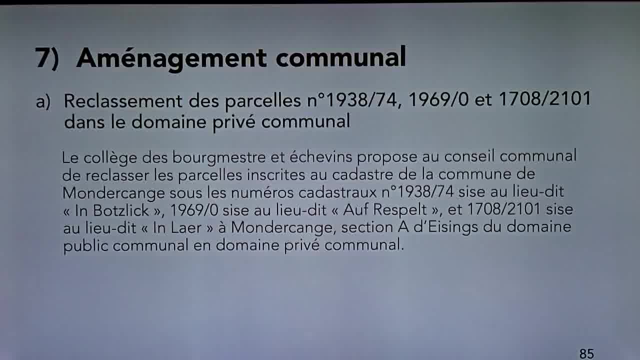 7) Aménagement communal a) Reclassement des parcelles n*1938/74, 1969/0 et 1708/2101 dans le domaine privé communal